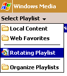 Once new files have been copied to the PDA, a "Windows Media Player for Pocket PC" playlist is generated and activated on the PDA. This means that all you need to do to listen to the new music, is to open the Windows Media Player and hit the "Playlist" menu-button, then select the "Rotating Playlist" item from the menu in the top. From now on your music list will always be up to date. |